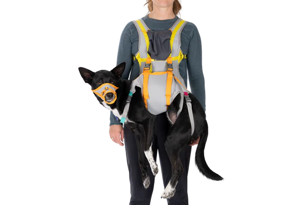 It includes two components: a lightweight first-aid dog muzzle, and a human vest with a built-in dog carrying sling. Together, these are designed to aid you if an emergency situation comes up and your dog is injured or sick and unable to get back to the car under their own power.